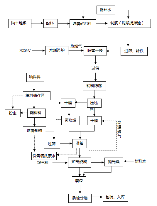 圖2.5-1 生產(chǎn)工藝流程圖 2.5.2主要生產(chǎn)設(shè)備 本項(xiàng)目主要生產(chǎn)設(shè)備、設(shè)施見(jiàn)表2.5-1,特種設(shè)備見(jiàn)表2.5-2。 表2.5-1 主要生產(chǎn)設(shè)備、設(shè)施一覽表 工序/線序號(hào)設(shè)備位置設(shè)備名稱(chēng)規(guī)格和型號(hào)單位數(shù)量備注制釉線1車(chē)間1樓球磨機(jī)YE3-280-6 55KW(5T)臺(tái)14 2車(chē)間1樓球磨機(jī)YE2-250M-6 37KW(3T)臺(tái)1 3車(chē)間1樓球磨機(jī)YE2-180M-6 15KW(1.5T)臺(tái)1 42樓平臺(tái)上攪拌機(jī)WSS 3.7KW臺(tái)24 5釉線平臺(tái)上攪拌機(jī)WSS 3KW臺(tái)12 6車(chē)間1樓振動(dòng)篩YZUL-15-2 1.1KW(1米)臺(tái)2 7車(chē)間1樓振動(dòng)篩YZUL-15-2 1.5KW(2米)臺(tái)21 82樓平臺(tái)上電動(dòng)葫蘆2.8T 8KW臺(tái)2 9車(chē)間1樓自動(dòng)除鐵機(jī)1.8萬(wàn)磁 3kw臺(tái)2 平臺(tái)線1出磚線下磚機(jī)順發(fā)單邊上下磚機(jī) 8kw臺(tái)6 2出磚線干式切割機(jī)蘭科 XTQ-4 8KW臺(tái)1 3素出磚平臺(tái)傳動(dòng)電機(jī)YE2-802-4 0.75KW臺(tái)50 4釉出磚傳動(dòng)電機(jī)YE2-802-4 0.75KW臺(tái)99 5素長(zhǎng)平臺(tái)傳動(dòng)電機(jī)YE2-802-4 1.1KW臺(tái)58 6釉長(zhǎng)平臺(tái)傳動(dòng)電機(jī)YE2-802-4 1.1KW臺(tái)47 7素、釉平臺(tái)自動(dòng)分線機(jī) 臺(tái)2 煤氣站1主樓煤氣發(fā)生爐4.6m臺(tái)2一期二線建1臺(tái)2主樓1樓工藝風(fēng)機(jī)TEV2-315S-2 110KW臺(tái)4 3加壓房加壓機(jī)YBX3-315L-2 160KW臺(tái)3 4煤場(chǎng)喂料機(jī)40T 4KW臺(tái)1 5煤場(chǎng)除塵機(jī)YE2-315M-4 132KW臺(tái)1 6煤場(chǎng)輸送帶YE3-112M-4 3KW臺(tái)5 7煤場(chǎng)YE3-112M-4 4KW臺(tái)7 8煤場(chǎng)YE3-112M-4 5.5KW臺(tái)3 9主樓YE3-112M-4 4KW臺(tái)2 10煤場(chǎng)滾筒篩YE3-160M-4 7.5KW臺(tái)1 施釉線1入磚線下磚機(jī)順發(fā)單邊上下磚機(jī) 8kw臺(tái)6 2施釉車(chē)間轉(zhuǎn)坯機(jī)1000mm 0.75kw套24 3施釉車(chē)間傳動(dòng)電機(jī)YE2-802-4 0.75KW臺(tái)360 4施釉車(chē)間傳動(dòng)電機(jī)YE2-802-4 0.55KW臺(tái)15 5噴墨房噴墨機(jī)TQ*325-4-SC(2)+MC(2)-19042705 14kw臺(tái)6 7施釉車(chē)間毛刷機(jī)800mm臺(tái)6 8施釉車(chē)間振動(dòng)篩YZUL-15-2 0.75KW(800mm)臺(tái)14 9施釉車(chē)間加熱器220V 4.5kw臺(tái)38 10施釉車(chē)間除塵機(jī)YE3-280M-4 75KW臺(tái)1 11施釉車(chē)間高腳泵YE2-802-4 0.75KW臺(tái)14 12施釉車(chē)間吹風(fēng)機(jī)YE2-802-4 0.75KW臺(tái)52 13施釉車(chē)間吹塵機(jī)YE2-802-4 1.5KW臺(tái)6 機(jī)電機(jī)修1馬路邊脫硫塔莫森環(huán)保套1 2脫硫塔循環(huán)泵YE2-315L-4 185KW臺(tái)2 3脫硫塔螺旋風(fēng)機(jī)YE2-200L-4 30KW臺(tái)2 4脫硫塔循環(huán)池?cái)嚢鑉E3-160L-4 15KW臺(tái)1 5脫硫塔抽石灰渣電機(jī)YE3-132S1-2 5.5KW臺(tái)2 6脫硫塔加藥泵YE3-100L2-4 3KW臺(tái)2 7脫硫塔工藝泵YE3-160L-2 18.5KW臺(tái)2 8脫硫塔過(guò)濾泵電機(jī)YE3-132S1-2 5.5KW臺(tái)2 9脫硫塔制藥攪拌機(jī)YE3-100L2-4 3KW臺(tái)1 10脫硫塔螺旋輸送電機(jī)YE2-180M-4 18.5KW臺(tái)1 11脫硫塔過(guò)濾池?cái)嚢铏C(jī)YE3-112M-4 4KW臺(tái)1 12空壓機(jī)房空氣壓縮機(jī)BMF75-811 55KW臺(tái)4 窯爐線1釉燒窯排潮風(fēng)機(jī)YE2-280S-4 75KW臺(tái)2 2釉燒窯一級(jí)排煙風(fēng)機(jī)YE2-355M-4 250KW臺(tái)2 3釉燒窯二級(jí)排煙風(fēng)機(jī)YE2-315S-4 110KW臺(tái)2 4釉燒窯一級(jí)助燃風(fēng)機(jī)YE2-280M-2 90KW臺(tái)2 5釉燒窯二級(jí)助燃風(fēng)機(jī)YE2-280S-2 75KW臺(tái)2 6釉燒窯急冷風(fēng)機(jī)YE2-280S-2 75KW臺(tái)3 7釉燒窯抽熱風(fēng)機(jī)YE2-315L2-4 200KW臺(tái)2 8釉燒窯直冷風(fēng)機(jī)YE2-280S-2 75KW臺(tái)2 9釉燒窯尾冷風(fēng)機(jī)YE2-280S-6 45KW臺(tái)1 10釉燒窯傳動(dòng)電機(jī)NCJF04Y-Y90L4-1.5-23 1.5KW臺(tái)135 11素?zé)G排潮風(fēng)機(jī)YE2-315L-4 185KW臺(tái)2 12素?zé)G一級(jí)排煙風(fēng)機(jī)YE2-355M-4 250KW臺(tái)2 13素?zé)G二級(jí)排煙風(fēng)機(jī)YE2-315S-4 110KW臺(tái)2 14素?zé)G一級(jí)助燃風(fēng)機(jī)YE2-280M-2 90KW臺(tái)2 15素?zé)G二級(jí)助燃風(fēng)機(jī)YE2-280S-2 75KW臺(tái)2 16素?zé)G急冷風(fēng)機(jī)YE2-280S-2 75KW臺(tái)3 17素?zé)G抽熱風(fēng)機(jī)YE2-315L2-4 200KW臺(tái)2 18素?zé)G直冷風(fēng)機(jī)YE2-280S-2 75KW臺(tái)2 19素?zé)G尾冷風(fēng)機(jī)YE2-280S-6 45KW臺(tái)1 20素?zé)G傳動(dòng)電機(jī)NCJF04Y-Y90L4-1.5-23 1.5KW臺(tái)100 21素?zé)稍锔G傳動(dòng)電機(jī)NCJF04Y-Y90L4-1.5-43 1.5KW臺(tái)60 22脫硫管線引風(fēng)機(jī)YE3-355L3-6 315KW臺(tái)1 分選線1檢選車(chē)間磨邊機(jī)800mm 115KW臺(tái)12 2檢選車(chē)間除塵機(jī)YE2-280M-4 90KW臺(tái)1 3檢選車(chē)間YE2-280S-4 75KW臺(tái)1 4檢選車(chē)間覆膜機(jī)蘭科立輝機(jī)電SKT-800 3KW臺(tái)6 5檢選車(chē)間自動(dòng)打包機(jī)多麥 8KW臺(tái)6 6檢選車(chē)間手動(dòng)打包機(jī)MH-101A 1KW臺(tái)2 7檢選車(chē)間自動(dòng)碼垛機(jī)多麥 8KW臺(tái)6 8檢選車(chē)間疊磚機(jī)10KW臺(tái)6 9檢選車(chē)間柱塞泵YE2-180L-4 22KW臺(tái)2 壓機(jī)線1壓機(jī)車(chē)間薩克米壓機(jī)PHC3500 100KW臺(tái)6 2壓機(jī)車(chē)間料車(chē)明協(xié)400*800 3kw臺(tái)6 3壓機(jī)車(chē)間除塵器YX3-315M-4 132KW臺(tái)1 4壓機(jī)車(chē)間翻坯器YS7124 3KW臺(tái)6 5壓機(jī)車(chē)間磨坯機(jī)1000mm 2.2kw臺(tái)6 6平臺(tái)連接線傳動(dòng)電機(jī)YE2-802-4 0.75KW臺(tái)122 7壓機(jī)車(chē)間送粉輸送帶YE3-112M-4 3KW臺(tái)20 8壓機(jī)車(chē)間YE3-112M-4 4KW臺(tái)4 9壓機(jī)車(ch